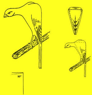Pièce jointe 115968 Pièce jointe 115969 POSITION : 40 Points. En position de travail, l'oiseau tend le cou vers l'avant, hausse les épaules. En forme du chiffre 7. La tête est invisible vue de dos. Le dos forme une ligne droite verticale avec la queue. L'oiseau tire légèrement sur les pattes. FORME GENERALE DU CORPS : 25 Points. Poitrine longue et large, en forme de coin triangulaire, vue de dos ou de profil. Dos rempli, large, sans être trop creux ni rond. Epaules: larges et hautes. Ailes: longues, adhérentes au corps. TÊTE & COU : 12 Points. Tête petite, ovale. Cou long et mince. PLUMAGE : 8 Points. Plumage brillant, le plus lisse possible. Toutes les couleurs sont admises, sauf le rouge. TAILLE : 5 Points. 17 - 18 cm. La grandeur se mesure de la pointe du bec à l'extrémité de la queue en suivant la ligne du dos. JAMBES & PATTES : 5 Points. Jambes longues, légèrement fléchies, bien emplumées. Les cuisses collées au corps. QUEUE : 5 Points. Queue longue, droite, étroite, bien fermée, en ligne droite avec le dos. CAGE d'EXPOSITION : Type Tunnel avec 2 perchoirs ronds (1 en haut et 1 en bas). Diamètre 12 mm. |
