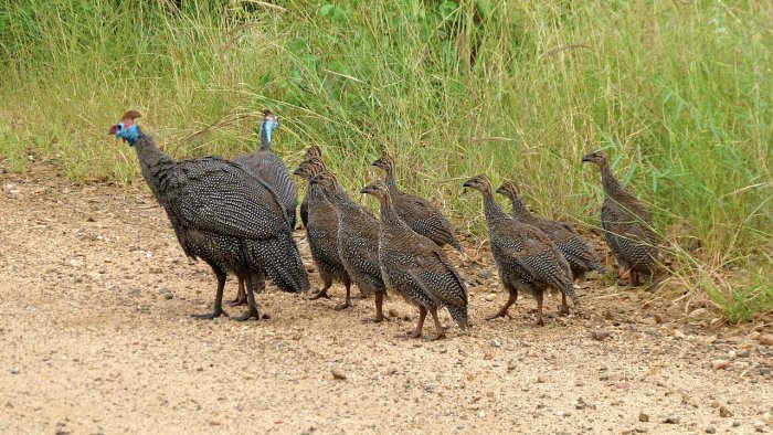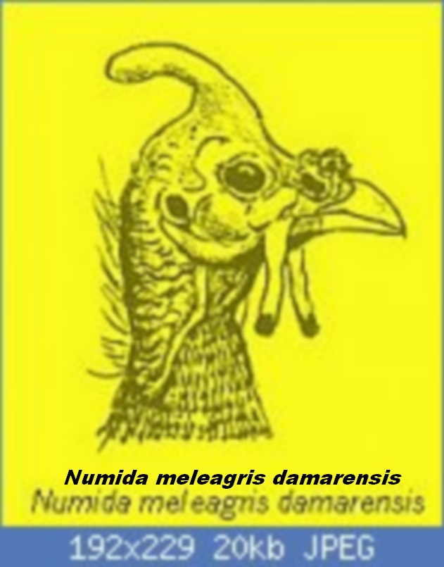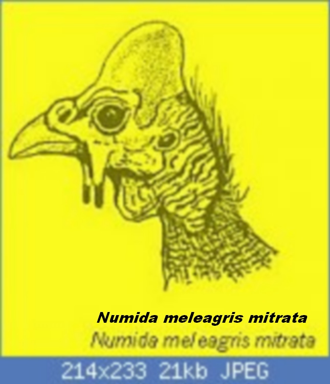 Photographies, illustrations & dessins : "Wikipédia Commons". LA PINTADE DE NUMIDIE OU PINTADE A CASQUE - (Numida meleagris). C'est la seule espèce du genre Numida (genre monotypique). Pièce jointe 116891 Pièce jointe 116904 Pièce jointe 120874 Origine : Cette espèce, subdivisée en de nombreuses races, ne vit qu'en Afrique. Description : La tête et le haut du cou sont nus, le crâne est orné d'une protubérance osseuse formant une espèce de casque. De chaque côté de la base du bec pend un barbillon triangulaire, dont la base est blanc-bleu verdâtre et la pointe rouge. La tête est bleu grisâtre clair, la face bleu blanchâtre. L'occiput est parsemé de rares plumes pileuses et raides, la gorge est vert bleuâtre, pattes gris foncé. Une bande de violet rougeâtre garnit le bas du cou et le jabot. Le reste du plumage est gris, parsemé de perles blanches. Sous-espèces de la Pintade de Numidie. Pièce jointe 120862 Pièce jointe 120863 Pièce jointe 120864 Pièce jointe 120865 Pièce jointe 120866 Commentaire : Les Pintades à casque vivent dans les contrées immenses et ouvertes, dans les steppes et les savanes. Les teintes de leur plumage forment un bon camouflage sous le jeu des ombres et des rayons du soleil. Elles s'établissent de préférence dans les steppes arides parsemées de bosquets de broussailles et d'acacias isolés. On les trouve sur les hauts plateaux et à l'orée des bois, où elles se retirent pour la nuit, ainsi que dans le lit sec et verdoyant des rivières taries, sur les alpages et dans les jonchaies marécageuses. Leur nourriture consiste principalement en verdures, mais elles mangent aussi quantité d'insectes vivants, qu'elles trouvent en abondance pendant l'année entière. Pièce jointe 116905Pièce jointe 116906 Pièce jointe 116907 Elles ont parfois le jabot rempli de termites, tandis que les baies diverses et les fruits d'un petit cornichon "Cocconia sessifolia", forment leur dessert. Elles aiment également les fruits de "Tribulus terrestris" et ceux des Acacias et font la chasse aux sauterelles. Les Pintades de Numidie se glisse furtivement vers leur proie et la capturent d'un coup de bec infaillible. Pièce jointe 116910 Pièce jointe 116909 Parcourant leur territoire en grandes troupes, elles pratiquent une véritable battue, faisant lever leurs proies sur un large front afin de les capturer plus aisément. Ces proies ne se constituent pas seulement d'insectes, mais aussi d'animaux plus grands, comme les grenouilles, les souris et mêmes des vipères. On peut observer l'année entière de grandes troupes de 50 à 100 individus, mais les couples s'isolent en période de parade. La femelle couve seule, mais dès que les jeunes sont âgés de quelques jours, ils viennent tous rejoindre la grande troupe. Pièce jointe 116911 Pièce jointe 120861 Les Pintadeaux s'adaptent avec une rapidité extraordinaire au rythme de marches des adultes. Ces oiseaux passent la nuit en perchant en hauteur dans un arbre, où ils font un vacarme infernal. Si quelques intrus s'aventure dans le voisinage du dortoir, la paix nocturne est aussitôt perturbée par leur tintamarre des plus tonitruants . m@l#ute45. |