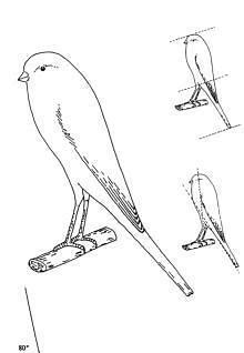 POSITION : 25 Points. Attitude érigée, respirant la fierté. Pattes longues, légèrement fléchies, cuisses visibles. PLUMAGE : 25 Points. Compact, court et bien serré. Ailes proportionnellement longues et symétriquement portées de chaque côté de l'axe du dos, touchant une queue compacte et bien serrée. TÊTE : 20 Points. Tête remplie et ronde. Nuque pleine, portée de manière égale vers le sommet des épaules et du dos. Bec court. Les yeux aussi près que possible du centre de la tête. CORPS : 10 Points. Epaules proportionnellement larges, rondes et bien portées et graduellement émergeant à la tête. Poitrine pleine et profonde, correspondant à la largeur et la rondeur des épaules et commençant à la base du bec. Tout en rondeur et diminuant graduellement (dos et ventre) vers la queue. Le ventre et le dessous de la queue formant une ligne droite. TAILLE : 10 Points. Minimum 17 cm. CONDITION & COULEUR : 10 Points. Couleur pure et bien répartie, en cas de coloration artificielle. En bonne condition et santé. Propre, toutes les couleurs sont admises. CAGE d'EXPOSITION : Type Tunnel avec 2 perchoirs ovales (1 en haut et 1 en bas). Diamètre 14 mm.