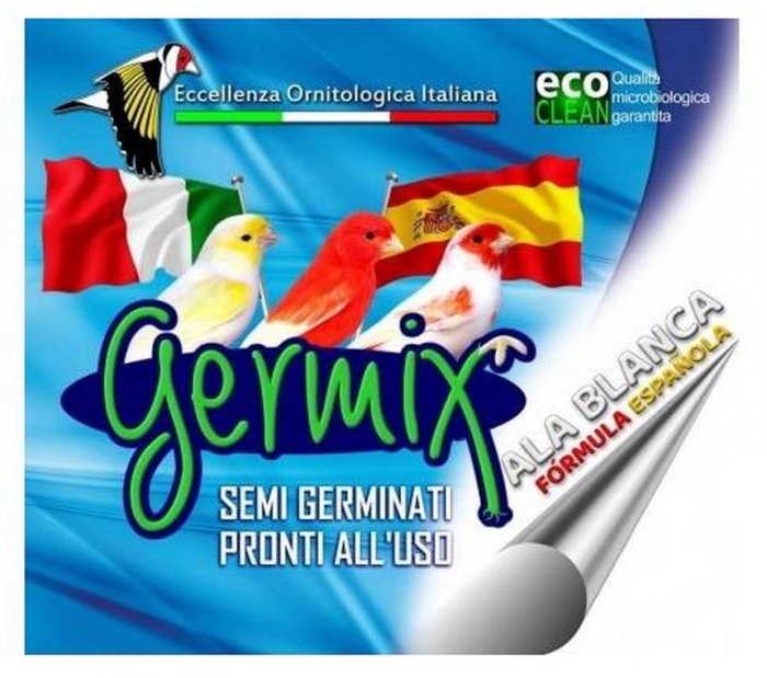 NOUVEAU CHEZ ORNIBIRD. COM GERMIX CANARY ALA BLANCA Formule Espagnole. Germix Canary Ala Blanca est un mélange de graines déjà germées conçu spécialement pour les Canaris ne devant pas avoir d'incrustations dans le plumage. L'utilisation du GERMIX permet à l'éleveur d'administrer en toutes sécurité des graines germées à ses oiseaux en éliminant le temps d'attente pour la préparation du produit et en éliminant les risques de maladies. Et cela en préservent les propriétés nutritionnelles des graines germées fraîches. Les graines peuvent être consommées immédiatement ou peuvent être réhydratées. COMPOSITION Contient du Niger, du Sésame, de l'Avoine et du Millet blanc. MODE D'EMPLOI Mélanger 2 portions de Germix avec une portion d'eau ensuite laisser reposer 10min. Enfin donnez le tel quel à vos oiseaux ou mélangez le avec votre pâtée. Le Germix peut aussi être utilisé sans être réhydraté. Pendant l'élevage: Tout les jours. Pendant l'année: 2 fois par semaine. AVERTISSEMENTS Après l’ouverture du paquet, reboucher soigneusement et conserver dans un endroit sec et frais et à l'abri des rayons du soleil. Si vous administrez le Germix humide il doit être enlevé après 12 heures de préparation.