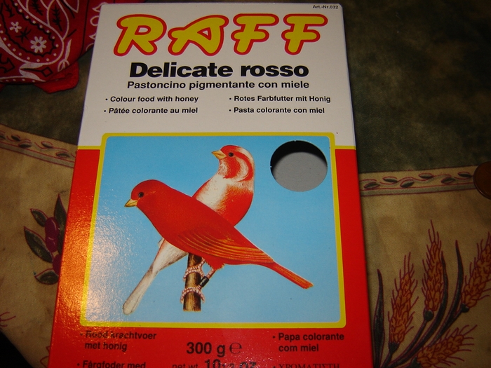 je vais vous l'expliquez de A à Z car beaucoup de messages reviennent tout le temps sur le forum au sujet de la coloration même si ce n'est plus la période a laquelle ont colorent -comment la pratique t'on ? ou plutôt comment moi je la pratique avec des bons conseils au départ d'un éleveur que vous connaissez tous Georges d'ailleurs je le remercie pour l'aide qu'il a apporter à une débutante comme moi ![]() les produits utilisés pour une bonne coloration sont pour moi -la canthatanxine des laboratoires Brunet et WYON -le gluten de mais -la pâtée colorante RAVASI grasse rouge appeler RAFF -la pâtée rouge sèche de CEDE a l'aide de ces 4 ingrédients je colores mes oiseaux a fond rouge pourquoi du gluten de mais ? -LE GLUTEN DE MAIS SERT A FIXER LE COLORANT - LE GLUTEN DE MAIS SERT AUSSI A ÉCONOMISER LA CANTHATANXINE le gluten de mais se trouve dans les magasins de pêche en faite c'est ni plus ni moins de l'amorce pour appâter les poissons le gluten de mais est une fine poudre jaune d'or insoluble dans l'eau donc avec le mélange que je fais ,l'utilisation ne sera que dans la pâtée au préalable j'ai préparer le colorant qui suit pour obtenir 100gr de colorant pur je mélange 50 gr de canthatanxine et 50 gr de gluten de mais :ce qui me donne mes 100 gr de colorant pur ,je dis bien 100 gr et non du colorant couper je vais revenir la dessus ,mais certains ont dit que avec du colorant couper ainsi ,mes oiseaux seront à moitié colorer lol la recette est simple et rassurez vous les oiseaux n'ont aucun troubles digestif avec l'emploi du gluten de mais ,aucun constat d'oiseaux malades ou en mauvaise santé chez moi à cause de cette préparation pour 1 kilo de pâtée (500gr de raff grasse rouge+500 gr de pâtée sèche rouge CEDE ) ajouter 3 cuillère a café de colorant préparer ci-dessus simple ,facile ,économique et vous aurez des oiseaux à fond rouge parfaitement colorés voici en photo les produits dont je me sert car c'est une méthode qui marche et je risque pas d'en changer ![]() vous pouvez voir des photos des canaris colorés grâce a cette méthode "économique"dans ma galerie photo