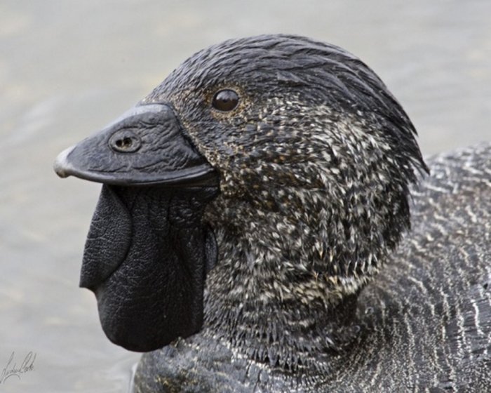 1) Détail de la tête du mâle, celui-ci porte une grosse caroncule ronde et noire en dessous du bec. Taille de l'oiseau : de 55 à 68 cm. 2) Couple nageant ensemble, le femelle se trouve au-dessus du mâle ce qui caractérise les deux partenaires, c'est que la femelle possède cet appendice beaucoup plus réduit. L'espèce est originaire du sud de l'Australie et de Tasmanie. Ces Canards vivent par couples, généralement sur l'eau enfermée de roseaux à l'intérieur du pays. Lorsqu'un danger les menacent, ils plongent où se sauvent en voletant rapidement à la surface de l'eau. Souvent, ils parcourent aussi à "pied" une grande distance pendant la nuit. Ils mangent presque exclusivement de la nourriture animale, grenouilles, insectes, coquillages et poissons. 3) Femelle avec ses deux petits. Le nid est construit dans un arbre surplombant l'eau où poussant dans l'eau, où encore dans une touffe de roseaux. Les roseaux fortement recourbés forment une plate-forme solide qui est tapissée d'herbe et de duvets. Les œufs très grands 52 X 78 mm, sont gris-vert, une nichée en comprend 2 ou 3. Les jeunes éclos se cramponnent instinctivement au cou de leur mère en cas de danger, et la Cane plonge avec eux. On a vu aussi des jeunes posés sur le dos de la mère qui nageait. Le mâle fait une cour (parade) curieuse à sa femelle, en émettant des sons sifflants, il serre les ailes contre le corps, puis les emploient pour jeter de l'eau vers l'avant. Il nage en compagnie de sa femelle en étendant ou en hochant la queue. Des oiseaux qui le gène dans ce petit jeu sont furieusement pourchassés et parfois tués. Ces Canards ont été gardés en captivité dès 1882, généralement il n'y avait que de rares sujets que l'on gardait pour admirer leur étrange aspect. Certaines collections possèdent actuellement des couples, et nous pouvons nous attendre à des résultats d'élevages concluant . Les oiseaux restent en bonne condition sur un régime comprenant principalement des substances animales. Il ne faut pas les placer en compagnie de petites espèces, qui seraient tuées et même dévorées. Le mâle répand une forte odeur musquée en période de parade. Dernière modification par maloute45 ; 09/11/2019 à 13h05. |
