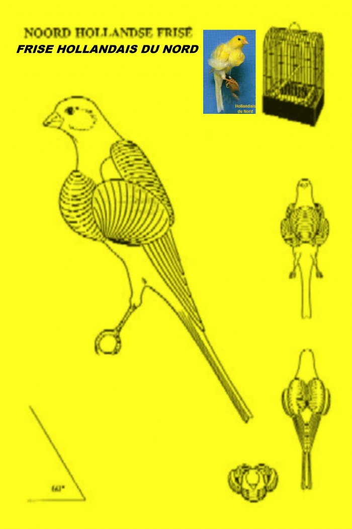 LES CANARIS FRISES Les variétés Frisées, même s'ils ne sont pas aussi recherchés que les Canaris chanteurs, même s'ils ne font pas partie des races infiniment précieuses du Harz, du Waterslager, du Timbrado ou du Flatwa sont, sans aucun doute, ce que l'on à créer de plus exquis et de plus gracieux. La première fois que l'on vit un Canari aux pennes capricieusement retournées vers le haut, on trouva que l'oiseau ressemblait beaucoup à une petite coiffe hollandaise et, de cette observation, naquit la dénomination de "Hollandais". Ce nom fut donné aux Frisés, même si leur lieu d'origine était très éloigné de la Hollande.