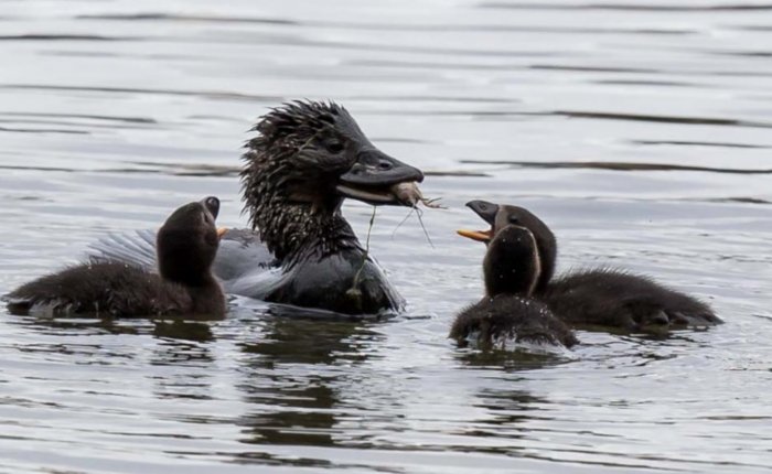 1) Détail de la tête du mâle, celui-ci porte une grosse caroncule ronde et noire en dessous du bec. Taille de l'oiseau : de 55 à 68 cm. 2) Couple nageant ensemble, le femelle se trouve au-dessus du mâle ce qui caractérise les deux partenaires, c'est que la femelle possède cet appendice beaucoup plus réduit. L'espèce est originaire du sud de l'Australie et de Tasmanie. Ces Canards vivent par couples, généralement sur l'eau enfermée de roseaux à l'intérieur du pays. Lorsqu'un danger les menacent, ils plongent où se sauvent en voletant rapidement à la surface de l'eau. Souvent, ils parcourent aussi à "pied" une grande distance pendant la nuit. Ils mangent presque exclusivement de la nourriture animale, grenouilles, insectes, coquillages et poissons. 3) Femelle avec ses deux petits. Le nid est construit dans un arbre surplombant l'eau où poussant dans l'eau, où encore dans une touffe de roseaux. Les roseaux fortement recourbés forment une plate-forme solide qui est tapissée d'herbe et de duvets. Les œufs très grands 52 X 78 mm, sont gris-vert, une nichée en comprend 2 ou 3. Les jeunes éclos se cramponnent instinctivement au cou de leur mère en cas de danger, et la Cane plonge avec eux. On a vu aussi des jeunes posés sur le dos de la mère qui nageait. Le mâle fait une cour (parade) curieuse à sa femelle, en émettant des sons sifflants, il serre les ailes contre le corps, puis les emploient pour jeter de l'eau vers l'avant. Il nage en compagnie de sa femelle en étendant ou en hochant la queue. Des oiseaux qui le gène dans ce petit jeu sont furieusement pourchassés et parfois tués. Ces Canards ont été gardés en captivité dès 1882, généralement il n'y avait que de rares sujets que l'on gardait pour admirer leur étrange aspect. Certaines collections possèdent actuellement des couples, et nous pouvons nous attendre à des résultats d'élevages concluant . Les oiseaux restent en bonne condition sur un régime comprenant principalement des substances animales. Il ne faut pas les placer en compagnie de petites espèces, qui seraient tuées et même dévorées. Le mâle répand une forte odeur musquée en période de parade. Dernière modification par maloute45 ; 09/11/2019 à 13h05. |