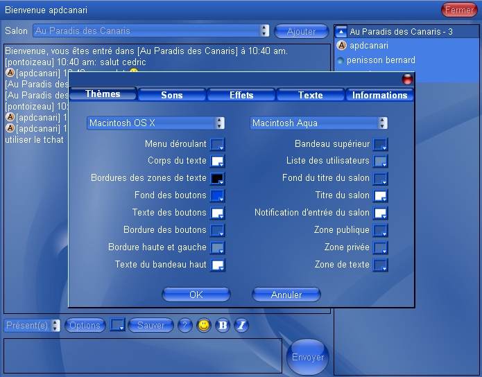Pour bien utiliser le tchat voici quelques conseils pratiques. Voici l'adresse : http://www.apdcanari.com/forum/chat/flashchat.php Pour se connecter au tchat, voici l'interface de connexion proposée. Vous devez utiliser le login et mot de passe que vous avez sur le forum. Voici à quoi ressemble le tchat, vous avez la partie à gauche la boite de dialogue, la partie à droite avec la liste des utilisateurs et en bas la boite de dialogue pour soumettre vos messages. Quand vous cliquez avec le bouton gauche de la souris sur un nom de membre dans la liste des connectés sur le salon en cours, vous pouvez effectuer les opérations suivantes. - Message privé : permet d'envoyer un message privé au membre souhaité, c'est réservé à l'échange entre vous et le membre connecté, comme sur le forum quand vous envoyez un message privé à un autre membre. - Inviter : permet d'inviter un membre dans votre salon que vous aurez crée auparavant. En effet, vous avez la possibilité de créer votre propre salon de discussion, soit public ou privé et protégé par un mot de passe. - Partager : permet d'envoyer des pièces jointes au membre souhaité, vous pouvez envoyer des images, fichier pdf,...avec une taille maximale de 512 Kb. - Ignorer : permet de refuser la reception de messages du membre souhaité, vous pouvez donc changer son statut entre ignorer et ne plus ignorer. - Banni : réservé à l'administrateur, permet de bannir un membre d'un salon ou du tchat. - Profil : permet de voir le profil du membre, il renvoit sur le profil du forum. Quand vous cliquez sur "Options" en bas à gauche vous avez la possibilité de configurer l'ensemble du tchat en fonction de vos désirs, elle comporte 5 onglets qui sont les suivants. Thèmes : permet de changer le thème et l'apparence du tchat. Sons : permet d'activer certains sons qui sont utilisés pour vous signaler la réception d'un message, si un nouveau membre se connecte, se déconnecte,... Vous pouvez aussi regler le volume et le volume Right Left de vos haut-parleurs. Effets : permet d'insérer votre arrière-plan personnel en sélectionnant une image sur votre ordinateur, il vous permet aussi de régler la transparence du tchat, de changer votre avatar du tchat par des smileys. Texte : permet de configurer la taille et la police des messages dans la boite de dialogue, il vous permet aussi de modifier la couleur des messages des autres membres par votre couleur utilisée. Sur la page d'accueil du forum, en bas de celui-ci est indiqué la liste des membres connectés sur le tchat actuellement.