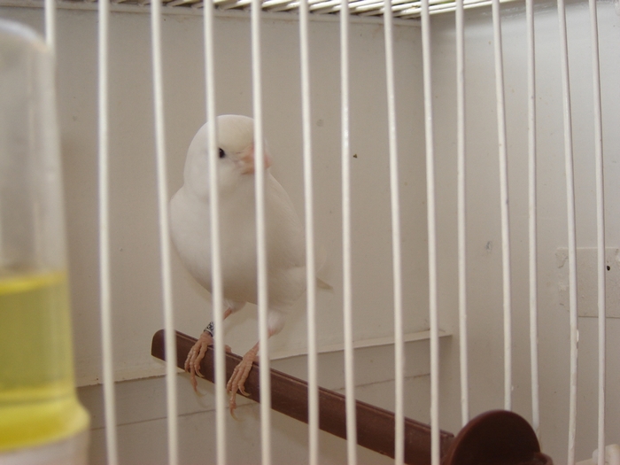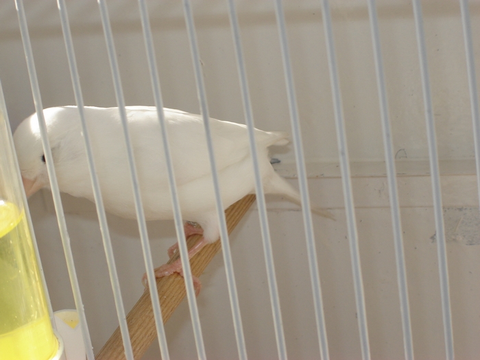 et ou je compte mettre 3 blanc récessif en individuel et 4 en stam enfin si tout va bien d'ici là le lavage c'est bien passer malgré que j'avais la boule au ventre il a durer pour 7 oiseaux ,un peu plus de 2 heures 30 les oiseaux n'ont pas stresser plus que je le pensais sauf un qui m'a fait le mort je n'ai pas trembler et je me suis sentie sur de moi de plus en plus sur a mesure qu'ils passaient a la bassine aucune perte de grandes plumes ailes et queue n'est a déplorer je suis aller avec délicatesse pour l'emploi du blaireau a barbe,de la brosse a dent en soie souple , du pinceau,ils ont été laver dessus ,dessous j'ai utiliser 3 bassines pour le lavage;shampoing et rinçage 2 fois ceci pour chaque oiseau afin d'enlever tout le shampoing qui laisse des reflets bleu sur l'oiseau et qui est disqualifiant en concours :le blanc doit être la pureté même une serviette de toilette éponge du sopalin bien absorbant j'ai profiter pendant que je les avaient en main de les examinés sur toute les faces(pas d'ongles manquants ,pas de blessure,pas de poux de plumes ect....)et je leurs ais enlevés les bagues de couleur et limer le bec a chaque oiseau laver,rincer direction ma cage hôpital préalablement chauffée a 36 degré ;1 heure avant de commencer pour le premier ,je l'ai poser a même le sol de la cage hôpital dont j'ai garni le sol de brisure de copeaux de hêtre et de litière végétale de mais concassés ce premier était comme tétanisé au sol ,puis il a repris ses esprits a mesure du lavage de l'un ,les autres séchaient ,en 2 heures de temps tous étaient sec ce temps de 2 heures ,j'en ais profiter pour nettoyer a fond leur cage d'expo individuelle je suis prête et eux aussi pour dans 15 jours quelques photos pendant et après