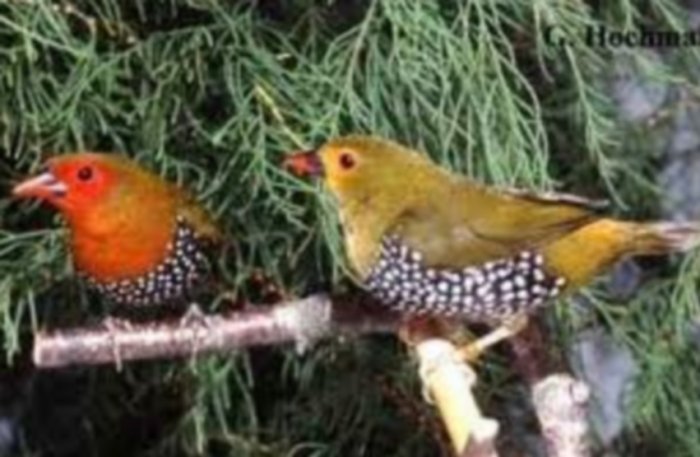 Origine : Cet oiseau peuple l'Afrique tropicale. Description : L'espèce mesure environ 11,5 cm de longueur. Il présente un léger dimorphisme sexuel : le mâle est plus coloré que la femelle avec en particulier la face rouge vif à rouge orangé (selon les sous-espèces) au lieu d'orange pâle. Une grande partie de son plumage présente une dominante vert olive avec les sus-caudales lavées de jaune et le ventre noir tacheté de blanc. Les yeux sont marron, le bec est noir à extrémité rouge et les pattes sont brunâtres. Ces Astrilds tachetés vivent parmi les hautes herbes dans les régions riches en broussailles et aussi à l'orée des bois. Ils recherchent leur nourriture dans les clairières, le long des sentiers et sur les champs de riz, se nourrissant principalement de graines, mais prenant aussi des insectes, spécialement en période de reproduction. Le nid est construit à une hauteur de 3 à 5 mètres, il est sphérique et possède une entrée latérale qui est confectionnée à l'aide d'herbe. A "Zanzibar" cette espèce est fréquemment gardée comme oiseau d'appartement. Ce ne fut qu'en 1935 que les premiers sujets ont été importés en Europe. L'acclimatation de ces petits exotiques exige des soins constants, une température assez élevée et des aliments appropriés mais, une fois bien acclimatés, les Sénégalis vert sont parmi les espèces robustes. Ils aiment vivre en compagnie d'autres oiseaux et entretiennent un contact permanent avec leurs congénères par de doux appels, ils semblent aussi se saluer mutuellement en se caressant le plumage l'un de l'autre. Si le couple est séparé, ces oiseaux ne survivent pas longtemps. La cage n'est pas un logement approprié pour eux, qui aiment se cacher parmi les plantes et les buissons. La volière intérieure bien plantée convient beaucoup mieux, il est nécessaire que le terreau du sol soit propre et régulièrement renouvelé. C'est le mâle qui construit le nid volumineux et libre, dans un endroit élevé et abrité, tout près de toit de la volière. Voici les matériaux employés : Foin, Fibres de coco, autres Fibres végétales et chanvre, les oiseaux y ajoutent aussi des particules de terreau, surtout autour de l'entrée. La femelle pond de 3 à 6 œufs qui sont alternativement couvés par les deux parents pendant une durée de 13 jours. Le couple élèvent bien leurs jeunes, à la condition expresse de disposer des nourritures d'élevage qui conviennent : des pupes de fourmis, des vers de farine, et si possible des enchytrées ( petit vers blancs) et des tubifex dans un petit bac rempli de terreau humide. (Nourriture vivante que l'on trouvent dans tout commerces spécialisés pour oiseaux). ainsi qu'un bon mélange de pâtée, exemple : 50% aux œufs + 50% universelle. Les jeunes prennent l'envol à l'âge de 3 semaines et commencent d'abord par manger du Millet en grappes. Il est recommandé de les loger en volière mixte, où ils imiteront les autres oiseaux à se nourrir de pâtées, de millet en grappes et plus tard d'un mélange de graines pour petits exotiques. Pour avoir du succès avec ces Astrilds tachetés et pour les garder plusieurs années en volière il sera indispensable de leur procurer tout au long de l'année de la nourriture vivante, il sera donc nécessaire que l'amateur apprenne è faire lui-même l'élevage d'enchytrées, de drosophiles et de vers de farine, moins coûteux que dans le commerce et aussi, ils seront de première fraîcheur... m@loute45.