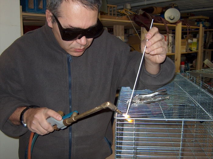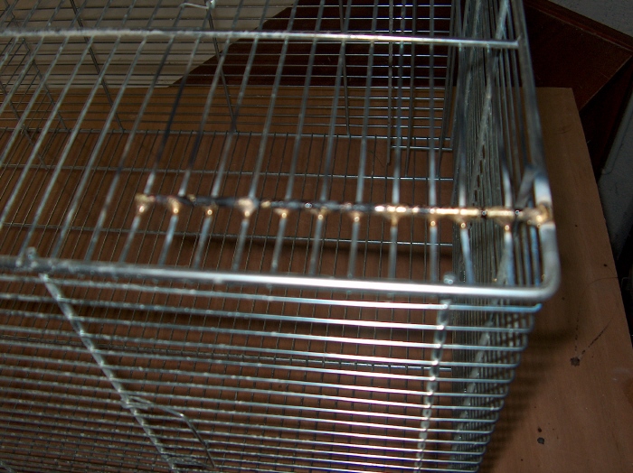 Choisir l’endroit de la futur porte, souvent dans un coin. Pièce jointe 7914 Couper une tige de fer de la largeur du nid, se sera le support. Nettoyer cette tige au papier de verre, la positionner sur la cage au bon endroit et la maintenir avec une pince. Pièce jointe 7915 Souder la tige de fer avec les barreaux de la cage. Pièce jointe 7916 Pièce jointe 7917 Couper à la scie à métaux les barreaux à la dimension de la porte. Pièce jointe 7918 Araser toutes les aspérités avec une lime. Pièce jointe 7919 Passer deux couches de peinture argentée. Pièce jointe 7920 Et le trou de la porte est terminé. Pièce jointe 7921 Il ne reste plus qu’à mettre en place la porte. Pièce jointe 7922 Voilà le résultat Pièce jointe 7923 Pièce jointe 7924 Pièce jointe 7925 Pièce jointe 7926 Vous pouvez ainsi empiler des cages pour former une colonne et juxtaposer des colonnes pour faire une batterie sans être gêné par les portes sur les côtés.[/JUSTIFY] |