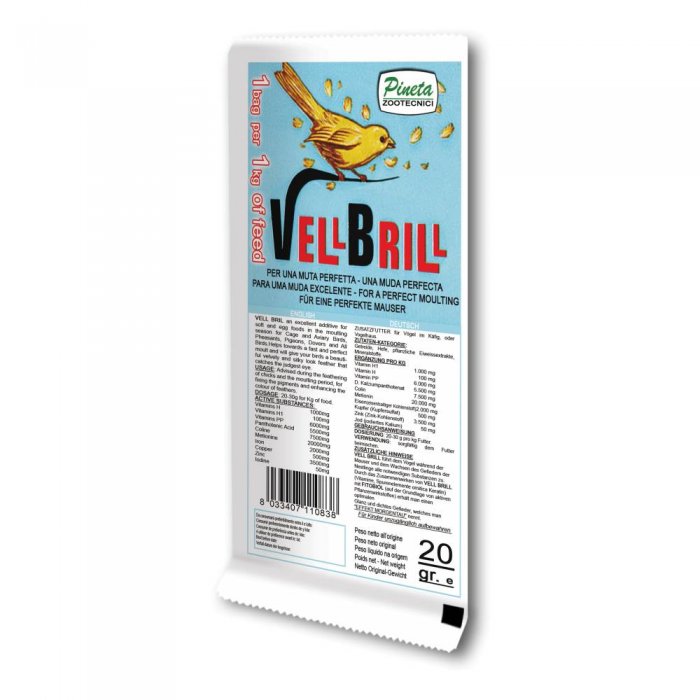 VELL BRILL - (Pineta Zootecnici). Pièce jointe 120034 Pièce jointe 120035 Pour une mue parfaite La mue et la croissance des plumes des jeunes avec vitamines, acides aminés et minéraux. (lato)Aliment complémentaire pour oiseaux de compagnie et/ou d’ornement. Composition - Catégorie des ingrédients: Grains de céréales et produits dérivés, graines ou fruits oléagineux et produits dérivés, produits de boulangerie et de la fabrication de pâtes, levures, minéraux. 3c301 Methionine 20.000 mg 3a890 Choline 7.500 mg 3a314 Vitamine PP 6.000 mg Acide pantothénique 5.500 mg E6 Zinc (carbonate de zinc) 3.500 mg E1 fer (carbonate de fer ) 2.000 mg Vitamine H1 1.000 mg E4 Cuivre (sulfate de cuivre pentahydraté) 500 mg Vitamine H 100 mg E2 Iode (iodure de potassium) 50 mg Additifs technologiques : conservateurs, antioxygènes. Additifs sensoriels : substances aromatiques. Mode d’Emploi: Bien mélanger au aliment. Dosage : 20-30 g par kg de pâtée. Durée du traitement : On conseille de commencer environ une semaine avant le début de la mue. Administrer quotidiennement pendant toute la période de mue. Informations supplémentaires : nous recommandons pour le développement du plumage des oisillons, pour la mue des adultes, pour fixer et exalter les couleurs, pour un plumage brillant, riche et velouté. L'Association des vitamines, oligo-éléments, minéraux, choline et méthionine contribue à la prévention des déficiences et favorise le bon fonctionnement des différents systèmes dans une période où un processus de rééquilibrage métabolique rapide est essentiel. COMPLÈTEMENT COMPATIBLE AVEC TOUS LES AUTRES ALIMENTS ET/OU ADDITIFS. À utiliser de préférence avant/Lot: voir l’emballage. Produit 36 mois avant la date de durabilité minimale indiquée. À conserver en lieu frais, sec, loin de toute source de chaleur et à l’abri de la lumière. Produit en U.E. Agrément αIT000147RE. Aliments pour animaux familiers, non destinés à la consommation humaine. Tenir hors de portée des enfants. |
