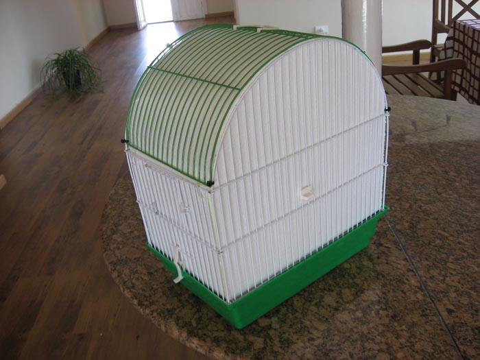Pour les personnes "beaucoup moins" bricoleur que notre ami Cedric, mais qui ont envie d'avoir des photos "clean", voici ce que j'ai fait: j'ai pris une cage normale, et j'ai coupe' des morceaux de polystyrene identique a chaque cote' de la cage et je les ai attaches avec de petits fils... c'est beaucoup moins joli bien sur, mais voila des images de cette cage et le resultat des photos ... |