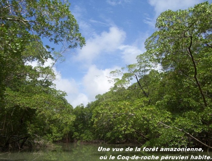 se réveille vers le début du mois d'avril. L'après midi tirant sur sa fin et le crépuscule tombant sont les témoins du rassemblement de vingt à quarante mâles soit dans les arbres soit dans les fourrés ou les rochers se trouvant près d'un endroit dégarni de toute végétation. Les oiseaux utilisent cet endroit durant des années pour s'y livrer à leurs danses nuptiales ou se combattre mutuellement. Leurs cris d'appels ressemblant aux sons d'**un oliphant peuvent s'entendre à presque mille mètres à la ronde. ** Un Oliphant (description) Cliquez sur l'image pour l'agrandir Tous les mâles de plus d'un an s'arrogent un morceau du théâtre ne dépassant pas le mètre carré. Ils s'emploient à nettoyer leur "territoire" de toutes les feuilles et brindilles qui peuvent s'y trouver dans l'intention de pouvoir ensuite s'y livrer librement à leurs parades respectives faites de pas de danse caractéristiques formant un rituel de cour. Chaque mâle veille à ce qu'une branche surplombe son podium et il en ôte toutes les feuilles et brindilles adjacentes. Il s'y perche ensuite en inclinant la tête vers l'arrière et en bombant le torse en paradant. Il va et vient entre cette branche et le sol pour attirer l'attention des femelles éventuellement , alertées par l'animation ambiante. Alertées donc par le tintamarre, les femelles se rassemblent, au départ en ordre clairsemé et ensuite en un groupe plus dense, à quelque distance de l'arène communautaire. Le spectacle commence lorsqu'une ou plusieurs femelles réceptives quittent le groupe pour s'approcher de ,l'arène. Les mâles exécutent de concert leur rituel de séduction en étalant leur huppe en deux moitiés, le bec surplombé disparaissant littéralement à la vue. Ils hochent la tête pour être certains que leurs mimiques soient bien aperçues par les femelles. Ils effectuent des rondes incessantes sur leur petit mètre carré personnel en frappant le sol de leurs pattes et en battant des ailes tout en poussant leurs cris sonores. La queue légèrement étalée, ils sautillent en étalant a qui mieux mieux leur superbe poitrine et leur dos orange jusqu'à ressembler à une grosse pelote dont le plumage retombe et se redresse sans cesse. Ils leurs arrivent dans l'excitation du moment de dépasser les limites de leur mini podium et alors gare ! Les échauffourées ne manque pas et elles ne cessent que lorsque l'un des combattants baisse pavillon et s'enfuit. Le vol est accompagné d'un son plus ou moins flûté occasionné par l'extrémité de leurs rémiges ouvertes. Lorsqu'une femelle a fait son choix, il s'agit le plus souvent du plus grand et du meilleur danseur, elle se glisse dans la minuscule enceinte de celui-ci, cela excitant encore plus les concurrents malheureux ! L'heureux élu cesse de parader pour prendre une attitude normale ce qui veut dire qu'il est intéresser par l'idylle (!) qui s'ébauche. La femelle s'envole alors perpendiculairement et la prise de contact n'a vraiment pas duré plus de dix secondes. Le mâle part lui aussi, à la suite de la femelle. L'accouplement a alors lieu dans le couvert végétal. Les deux oiseaux reviennent ensuite séparément vers l'arène, le mâle pour reprendre son rituel dans l'attente d'une nouvelle bonne fortune et la femelle pour se choisir un autre bon partenaire. La reproduction du Coq de Roche du Pérou (Rupicola peruviana), toutes sous-espèces confondues a lieu entre la mi-mai et juillet, plus tard donc que chez le Coq de Roche orange. C'est dû à la situation géographique de l'habitat du Coq péruvien, bien plus haut dans la Cordillère des Andes et donc plus frisquet pour ne pas dire plus. Les mâles adultes se rassemblent également tard dans l'après-midi, au crépuscule même pour y parader de concert dans une arène commune. Le nombre de mâles est plus réduit que chez le Coq de Roche orange, huit oiseaux au maximum. L'arène en est d'autant réduite en superficie. Il n'empêche, il existe plus d'endroits où les communautés se réunissent pour parader, cela compense la taille réduite de chaque arène. Ici aussi, une ou deux branches nues surplombes l'endroit où la danse se déroule, elle se trouve bien à cinq ou sept mètres de haut, bien plus donc que chez le Coq de Roche orange qui se contente d'une branche pendante ou du sol pour parader. Autre différence : les mâles du Coq de Roche péruvien ne paradent pas de manière individuelle mais ils dansent toujours en paires, la tête de l'un dirigée vers la tête de l'autre et en effectuant les mêmes pas de danse sur le même rythme. On jurerait un ballet organisé lorsque plusieurs paires de mâles sont entrain de danser en même temps ! Et fait remarquable les figures effectuées et de rythme de celles-ci sont identiques à celles du Coq de Roche orange. Chaque arène est "régie" par un mâle qui se trouve entre les paires de danseurs, il contrôle non seulement une plus grande surface de terrain mais il est aussi le seul qui puisse s'accoupler avec les femelles spectatrices. Les autres mâles, vassaux, ne sont donc que spectateurs passifs et ils peuvent le cas échéant s'accoupler aux femelles de deuxième rang. Les mâles âgés d'une ou deux années ne sont pas encore complétement en couleurs et ils sont réduits à assister aux ébats de leurs aînés en perchant sur les arbres environnants. Les femelles en condition du Coq de Roche du Pérou se rassemblent elles aussi en groupes mais ceux-ci ne sont pas aussi importants que ceux du Coq de Roche orange. Ces groupes se tiennent à quelque distance de l'arène mais les femelles en sortent individuellement pour s'approcher des mâles. Le mâle dominant interrompt instantanément son spectacle lorsqu'une femelle se pointe sur la scène, il va immédiatement se percher sur la branche en surplomb pour y reprendre sa danse et parader dans toutes les positions possibles et imaginables bien aidé par son superbe plumage. Lorsque la représentat