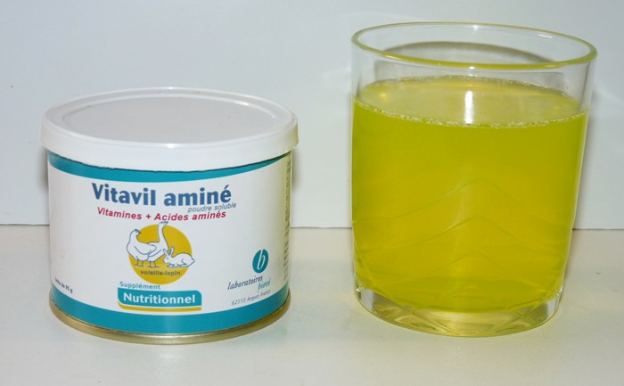 Après en avoir parlé à quelques amis éleveurs, et après 1 an d’utilisation, je dois dire que je suis très satisfait des résultats positifs obtenus sur la bonne santé de mes oiseaux qui ont traversé toutes les périodes de l’année sans témoigner la moindre carence. Aussi, fort de cette expérience étalée sur un an, j’ai décidé d’en parler aujourd’hui sur mon blog afin d’en faire profiter le maximum d’entre vous. Cette information ne revêt aucun caractère obligatoire, libre à vous de décider de son emploi ou pas. Ce complément nutritionnel prévu pour les volailles, lapins, ovins, caprins, équins, bovins, porcins destinés à la consommation humaine, est fabriqué avec des règles de contrôle qualité très strictes. Par conséquent nous pouvons le considérer comme un produit extrêmement fiable. Il est recommandé - Pour les déficits vitaminiques d'origine alimentaire - Pour couvrir les besoins lors de la gestation, la lactation, la reproduction et la croissance - Pour servir d’adjuvant des traitements vermifuges, anticoccidiens et anti-infectieux. - Pour augmenter la ponte et le pouvoir d'éclosion. ETAT PHYSIQUE : Poudre soluble couleur or. L’eau est rapidement colorée en prenant un aspect jaune citron. Contrairement à d’autres produits, Vitavil aminé ne dégage aucune odeur dans le temps. DOSAGE : 1 cuillère à café (4,5 g valeur mesurée avec une cuillère balance digitale) pour 8 litres d’eau, soit un bon 1/2 gramme pour 1 litre d’eau. Ne pas trop dépasser la dose recommandée, ce complément nutritionnel est très concentré, risque d’excitation des oiseaux, si traitement prolongé. CONDITIONNEMENT et PRIX : En pot de 95 g et 375 g. Personnellement, j’utilise des pots de 95 g largement suffisants compte tenu des dosages. A commander auprès de votre pharmacien (livraison en 24 heures). Prix : Aux environs de 14,00 euros le pot de 95 g. COMPOSITION pour 100 g : Vitamines: A..........2 500 000 UI D3...........200 000 UI E................4 000 mg B1................300 mg C................6 000 mg K3................300 mg B2, B3, B6, B12, H Acides aminés : qui permettent à l’organisme de reconstituer les matières protéiques : Les essentiels : isoleucine, leucine, lysine, méthionine, phénylalanine, valine. Les non essentiels : alanine, arginine, acide aspartique, acide glutamique, cystine, glycine, histidine, lysine, proline, sérine, tyrosine. CONDITIONS D’EMPOI : 1) Préparation pour la reproduction soit 4 semaines avant la mise en accouplement - 3 jours consécutifs par semaine 2) Période de reproduction : - 1 fois par semaine sauf entre deux tours 3 jours consécutifs sur une semaine uniquement pour rebooster les femelles. 3) Période de mue - 2 jours consécutifs par semaine 4) Période de repos : - 1 fois par semaine ASPECT PRATIQUE et ECONOMIQUE : Gestion unique de Vitavil aminé qui s’est substitué à tous les compléments nutritionnels spécifiques que l’on trouve dans le commerce pour chaque période de l’année (préparation à la reproduction, reproduction, mue, repos). Economie financière non négligeable. © Georges BUONOMANO Dernière modification par Geojos ; 30/01/2010 à 07h10. |