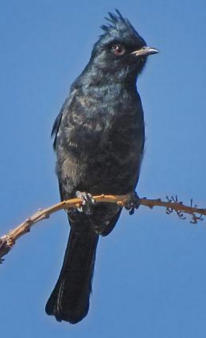 Origine : Mexique. Description : La couleur générale est le noir à reflet bleu. Les cuisses sont brun-noir, les barbes intérieures des grandes rémiges sont en grande partie blanches. Les yeux sont brun foncé, le bec et les pattes noirs, taille 17 cm. La femelle a le dessus du corps gris foncé, le milieu de la huppe est noir, les régions entourant les yeux et les oreilles sont brunâtres, le dessous du corps est brun. Commentaire : Ces oiseaux vivent dans les grands arbres situés dans les ravins isolés, se nourrissant d'insectes qu'ils capturent en vol à la façon des Gobe-mouches. Ils mangent aussi diverses baies, principalement les baies gluantes du Gui. Leurs gésiers présentent un mécanisme particulier qui leur permet de séparer la chair des baies de la peau, qui est traitée séparément dans les intestins. Ce mécanisme, dont il est le seul oiseau spécialisé dans la consommation de Gui à bénéficier, lui permet une meilleure digestion des baies. m@loute45.