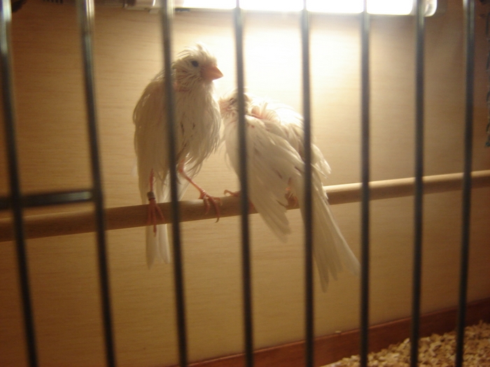 et ou je compte mettre 3 blanc récessif en individuel et 4 en stam enfin si tout va bien d'ici là le lavage c'est bien passer malgré que j'avais la boule au ventre il a durer pour 7 oiseaux ,un peu plus de 2 heures 30 les oiseaux n'ont pas stresser plus que je le pensais sauf un qui m'a fait le mort je n'ai pas trembler et je me suis sentie sur de moi de plus en plus sur a mesure qu'ils passaient a la bassine aucune perte de grandes plumes ailes et queue n'est a déplorer je suis aller avec délicatesse pour l'emploi du blaireau a barbe,de la brosse a dent en soie souple , du pinceau,ils ont été laver dessus ,dessous j'ai utiliser 3 bassines pour le lavage;shampoing et rinçage 2 fois ceci pour chaque oiseau afin d'enlever tout le shampoing qui laisse des reflets bleu sur l'oiseau et qui est disqualifiant en concours :le blanc doit être la pureté même une serviette de toilette éponge du sopalin bien absorbant j'ai profiter pendant que je les avaient en main de les examinés sur toute les faces(pas d'ongles manquants ,pas de blessure,pas de poux de plumes ect....)et je leurs ais enlevés les bagues de couleur et limer le bec a chaque oiseau laver,rincer direction ma cage hôpital préalablement chauffée a 36 degré ;1 heure avant de commencer pour le premier ,je l'ai poser a même le sol de la cage hôpital dont j'ai garni le sol de brisure de copeaux de hêtre et de litière végétale de mais concassés ce premier était comme tétanisé au sol ,puis il a repris ses esprits a mesure du lavage de l'un ,les autres séchaient ,en 2 heures de temps tous étaient sec ce temps de 2 heures ,j'en ais profiter pour nettoyer a fond leur cage d'expo individuelle je suis prête et eux aussi pour dans 15 jours quelques photos pendant et après