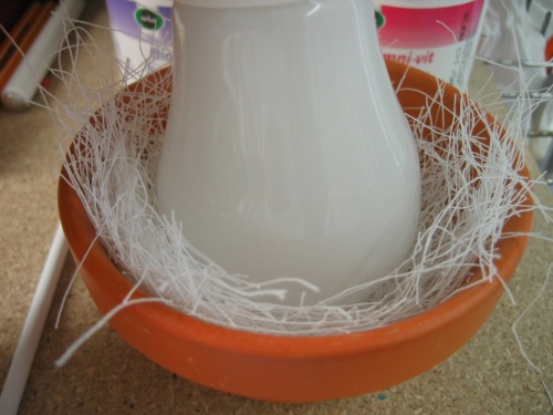 - ensuite, fabriquer grossièrement le nid avec le matériel (fibres de cocos, sisal ) et arrondir le nid au moyen d'une ampoule électrique (partie ronde) que l'on fait tourner dans le nid en appuyant modérément.