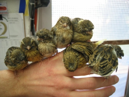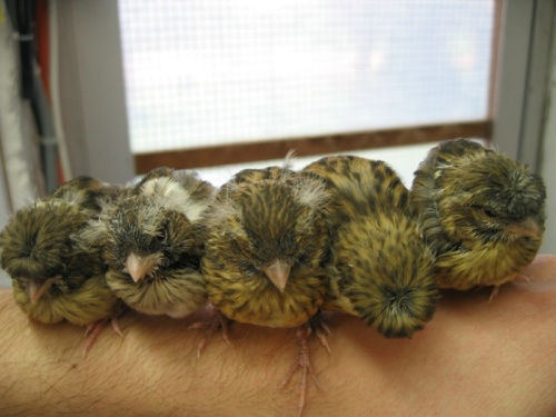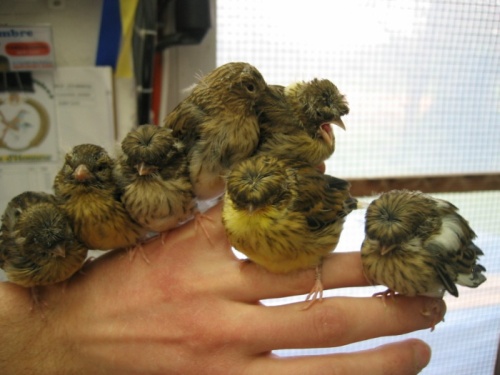 Jeunes Gloster au nid, de gauche à droite : Corona vert panaché, Corona isabelle blanc et Consort bleu.
