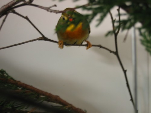 La femelle, quant à elle, porte la même livrée que le mâle, mais elle n'a jamais de rouge carmin ou de jaune brun sur la poitrine, mais uniquement sur la couronne.